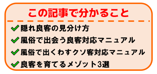 風俗で働いていると必ず出会う"良客"と"クソ客"。風俗嬢とはいえ、ひとりの『人間』。クソ客を排除して良客に気に入ってもらえればぐーんと働きやすくなりますよね!そんな"良客"と"クソ客"への対応マニュアルで働きやすい環境を作って楽しくお仕事しましょう♡