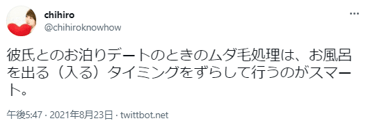 なので、絶対にお泊まりデートの前の日にムダ毛処理はしておきましょう。生えるスピードが速くて前日じゃ無理…という場合は、デートに出かける直前にお手入れをしてくださいね♡