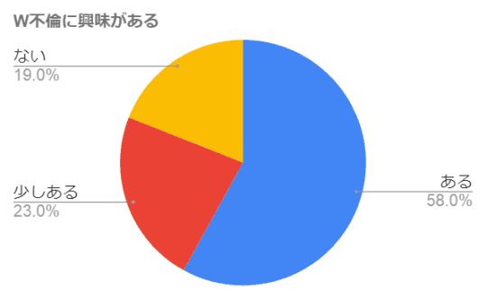 既婚者の20代~40代の男女100人に聞いたアンケートでは、W不倫に興味があると答えた方は、興味がある・少しあるを合わせると81%もの人がW不倫に興味を持っているんです。