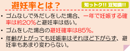 この後に紹介する、生挿入セックスで外だしした場合の妊娠率というデータがあります。