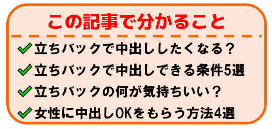 立ちバックは、男性にとって女性を思う存分抱くことのできる気持ちのいいセックスですが、ついつい「中出し」しちゃいたくなるものです。もちろん中出しはなかなかできないものです…けど、今回ご紹介するテクニックを使えば、女性も応じてくれるかもしれません!
