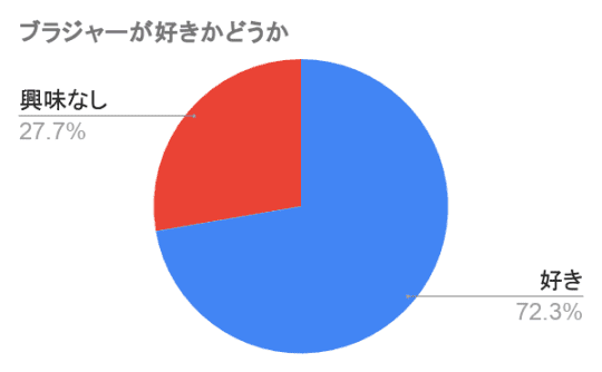 成人男性100人を調査したところ、グラフのような結果になりました。ブラジャーの人気は明らかでしょう。そもそも嫌いっていう声を聞きません。興味がない人こそいますが、強い嫌悪感を持っている人はいませんでした。