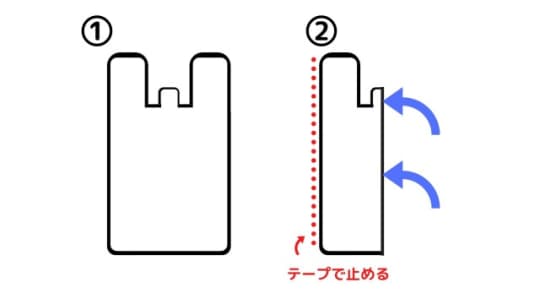 - レジ袋を縦半分に折り畳み、側面の合わせ目をテープで止める