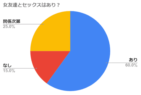 筆者が10代~40代の男性30人に聞いたところ、『女友達とのセックスはあり』と答えた人が多いですね。