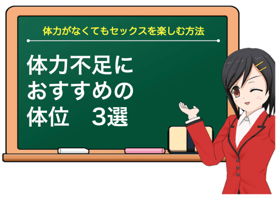 体力がない人に試して頂きたいもう1つの方法としては、先ほどご紹介したように楽にセックスが出来る体位でセックスをすることです。