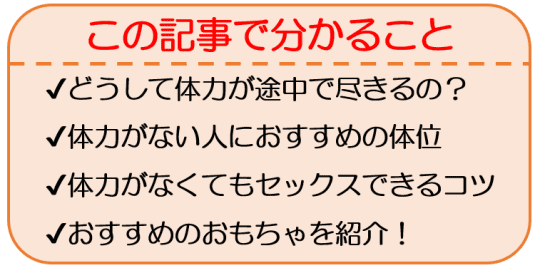 体力が持たなくてエッチがしんどい…。セックスの後疲れてしまう。男性に向けて、そんな風に悩んでいる方に、体力が無くてもエッチが楽しめる方法を実体験を通して紹介します。工夫さえすれば、誰でも体力がないことを気にせずにセックスを楽しむことが出来るんです!