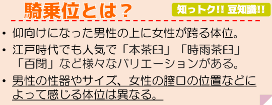 こちらの体位は主に女性が動いてくれる為、相手の女性が嫌がらない限り、男性には大変楽な体勢でセックスが楽しめる一番オススメな体位になります。