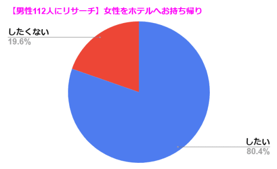 これは僕が112人の男性にリサーチした統計ですが、実に男性の約80%が「女性をホテルへお持ち帰りしたい!」と考えているようです!