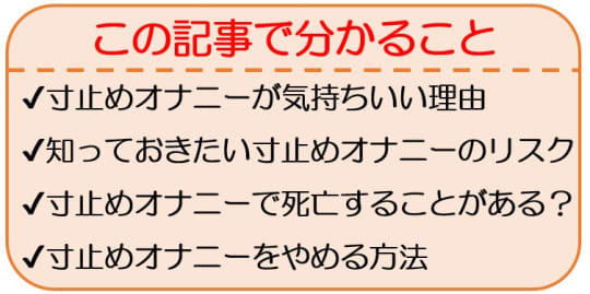 「言い過ぎでは?」と思われるかもしれませんが、死亡する可能せがゼロではないうえに、多数のリスクがある以上は寸止めオナニーはするべきではないでしょう。