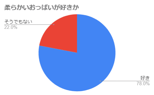 「柔らかいおっぱいが好きか」という質問に、このような結果が出ています。実に8割近くの男性が、柔らかいおっぱいを好んでいることが分かりますね。