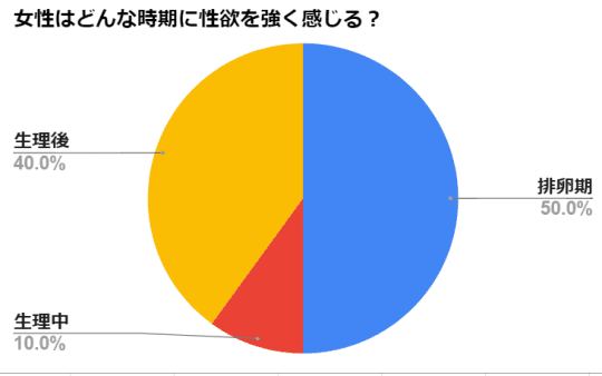 多くの女性は、この3つの時期に性欲が爆発します。一番性欲を感じやすいのは排卵期ですが、でも意外と生理後にセックスしたくなる♡という女性が多いのが分かりますね。