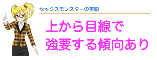 でも、自分とのセックスのための要望…平日のオナニー禁止、アルコール禁止、タバコ禁止、性欲剤の強要、勃起や精子に良い食事などの強要を数多くしてくる女性には…男性に取って精神的な負担を感じるので、セックスモンスターと判定する男性が増えて来ています。