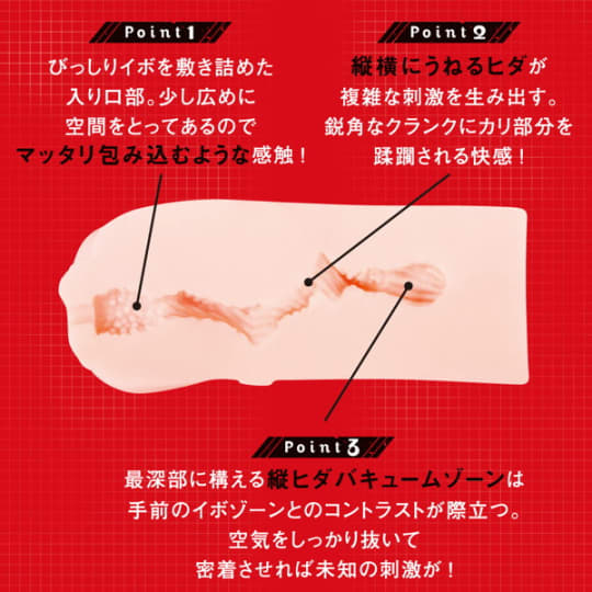 螺旋型の入り口から快感が昇ってきて、三段階に分かれた壁が良い刺激を与えてくれます。そして奥のバキューム感がとても気持ち良く、まさに名器。