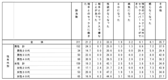 以下の表は2013年に「セックスレス」と認識している20~40代の男女を対象に「セックスレスになったきっかけ・原因」についてアンケート調査した時のものです。男女ともに「性欲がなくなった」が一番です。次に「相手とのセックスに飽きた」という結果がでています。