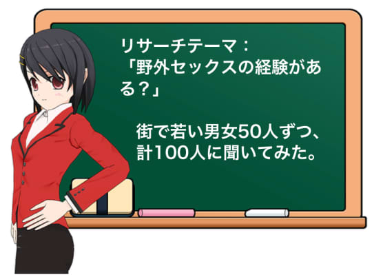 私は野外セックスの経験がどれくらいあるのか、街で若い男女50人ずつ、合計100人に聞いてみました。