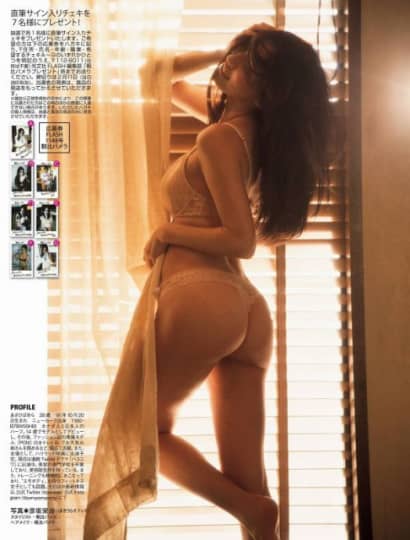 「ランジェリー姿」の悩ましげなポーズを取っている「都丸紗也華」の後ろ姿を捉えていて、その「プリン」としたかたちの良さが丸わかりの「お尻」に注目してしまいます!