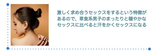 体位替えも多いですし、激しく求め合うセックスをするという特徴があるので、草食系男子のまったりと穏やかなセックスに比べると汗をかくセックスになります。