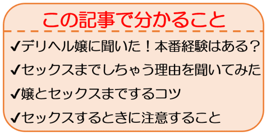 今回は、デリヘル嬢の人がセックスをしているのか?に付いて、解説していきます!