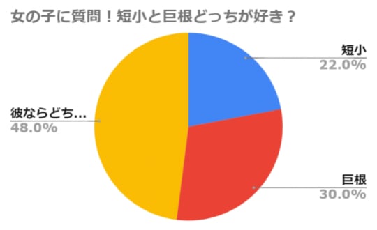セックスするなら短小がいいか巨根がいいか?と聞かれると、若干巨根の方が人気ですが、注目してほしいのが、円グラフの黄色い部分「好きな彼ならどちらでもいい」という意見が半数近いこと!