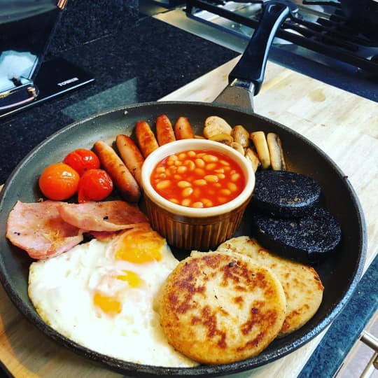 スコットランドの伝統ある朝食は、卵料理(スクランブルか目玉焼き)・ベーコン・ブラックプディング・ハギス・ポテトスコーン・ベイクドビーンズ・焼きトマト・マッシュルームです。