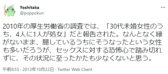 年々男性とのセックス経験がないまま30代を迎えている女性が増えてきていますし、高齢処女の割合がどんどん高まってきています。