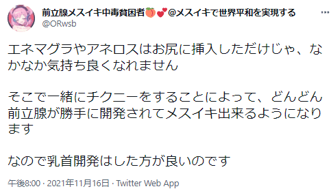 筆者の体験では、より太く柔軟な本物のチンポで突かれると、よりメスイキに到達しやすいのも事実ですが、エネマグラでも充分にメスイキ到達可能です。