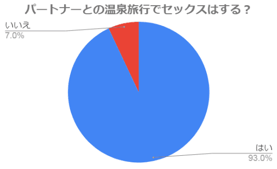 「パートナーとの温泉旅行でセックスはする?」という質問に「はい」と回答した人は、84人。つまり93%もいることがわかりました。