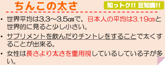 皆さんご存知のオナホールで名をはせている「TENGA」によると、日本人の平均サイズとされる亀頭の直径は3.53cmで竿の部分の直径は3.19cmというデータがあります。