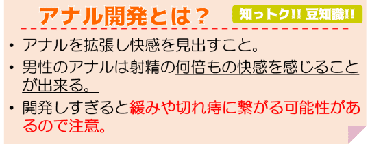 ちなみに、男性のアナルの奥には「前立腺」と呼ばれている性感帯があるので、指先を曲げて刺激してあげると「射精しちゃう部位」なんです。