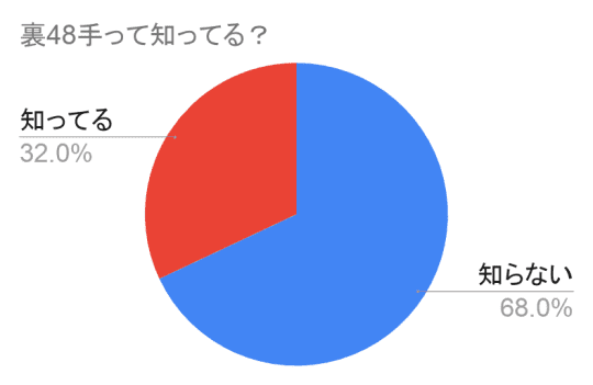 こちらの画像は、Twitterにて集まってくれた20〜50代の男女100人を対象に、「裏48手って知ってる?」と質問したときの結果をグラフにまとめたもの。