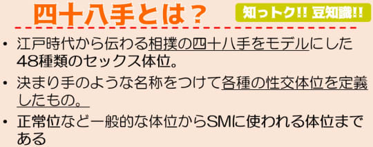 江戸時代から伝わるもので、セックスの体位をまとめたものを「48手」と言い、現代でも圧倒的な知名度を誇っていますよね。