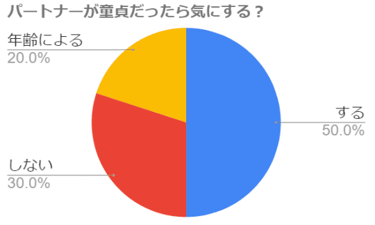 気になる結果は上記のグラフの通り、半数の人が「気にする」と答えました。3割ほどの人は「気にしない」、残りの2割は「年齢による」と答えてくれていますが男性が童貞を卒業するのは何歳くらいなんでしょうか?