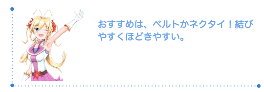 私のおすすめは、ベルトかネクタイです!誰でも家にあって、結びやすくほどきやすいんです。