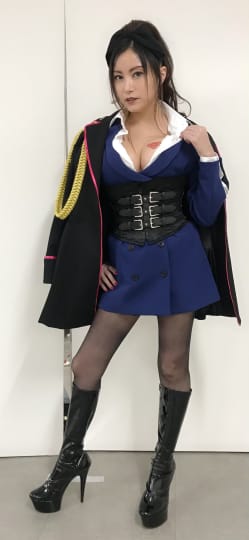 胸元がガッツリ開いたシャツ、腰がキュッと引き締まったタイトスカートに黒パンスト、つい踏まれたいと思ってしまう黒ロングブーツ…たかはし智秋の魅力をこれでもかと言うくらい発揮しています!