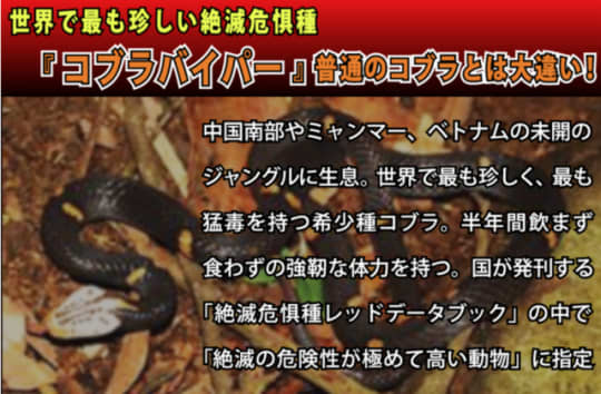マムシやスッポンも、このスペリミンを多く含むと言われていますが、コブラバイパーはそれらの300〜500倍のスペリミンを含んでいます。