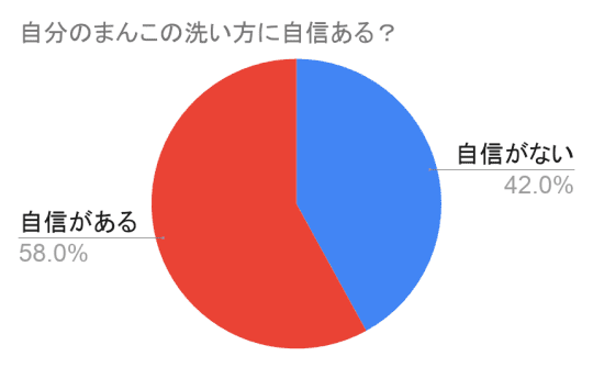 こちらの画像は、Twitterにて集まってくれた20~40代の女性100人に「自分のまんこの洗い方に自信ある?」とアンケートを取ったときの結果をグラフに表したもの。
