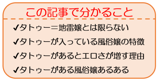 あなたはデリヘルを利用する時、タトゥーのある女の子を選びますか?それともタトゥーはNGですか?筆者のデリヘル勤務の経験から、タトゥーのある女の子のプレイの特徴やエロさ、地雷率などを解説します。これを読めばタトゥー嬢への考え方が変わるかもしれませんよ!