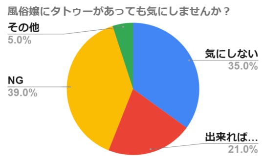 このアンケートでは、嬢のタトゥーを気にしない人は35%で、できれば避けたい人とNGという人を合わせると60%と、まだまだタトゥーを避けたいと思っているお客さんが多いということがわかります。
