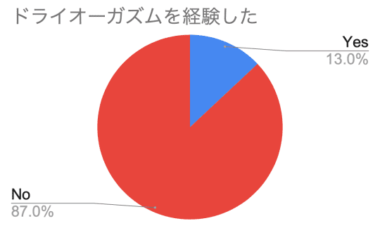 とあるエロ雑誌で、20代から40代のアナニーする男性50人に、ドライオーガズムを経験したことがあるかアンケートを取ったところ、以下のグラフのように、ドライオーガズムを経験したことがある男性は、13%にとどまりました。