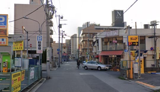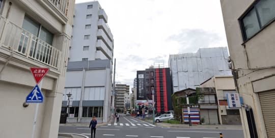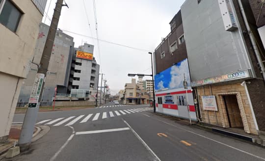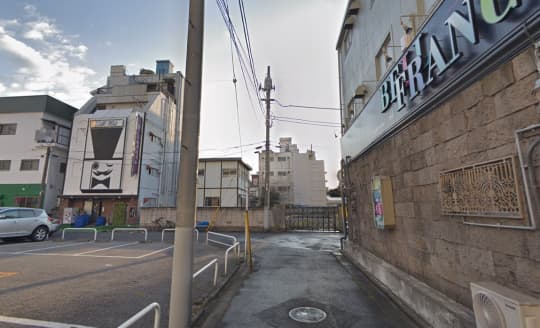 右側向こう角の建物センターフジビル3階が、目的地「スキャンダル」です。