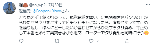 ・女性がM字開脚をし、 男性側が女性のつま先や足の甲を軽くつかむ、踏むなどして動かないように固定。「動いたらお仕置きね」などと決めておき、ローターを使ってクリ責めする