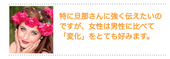 特に旦那さんに強く伝えたいのですが、女性は男性に比べて「変化」をとても好みます。「服装」「髪型」「店」新しいものにとても魅力を感じるようにできています。